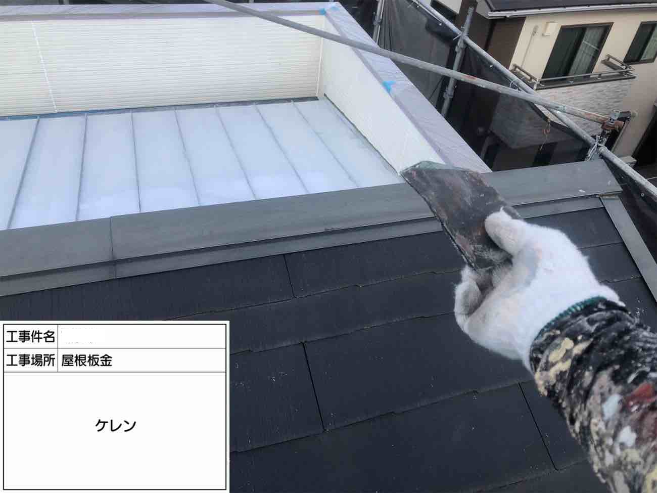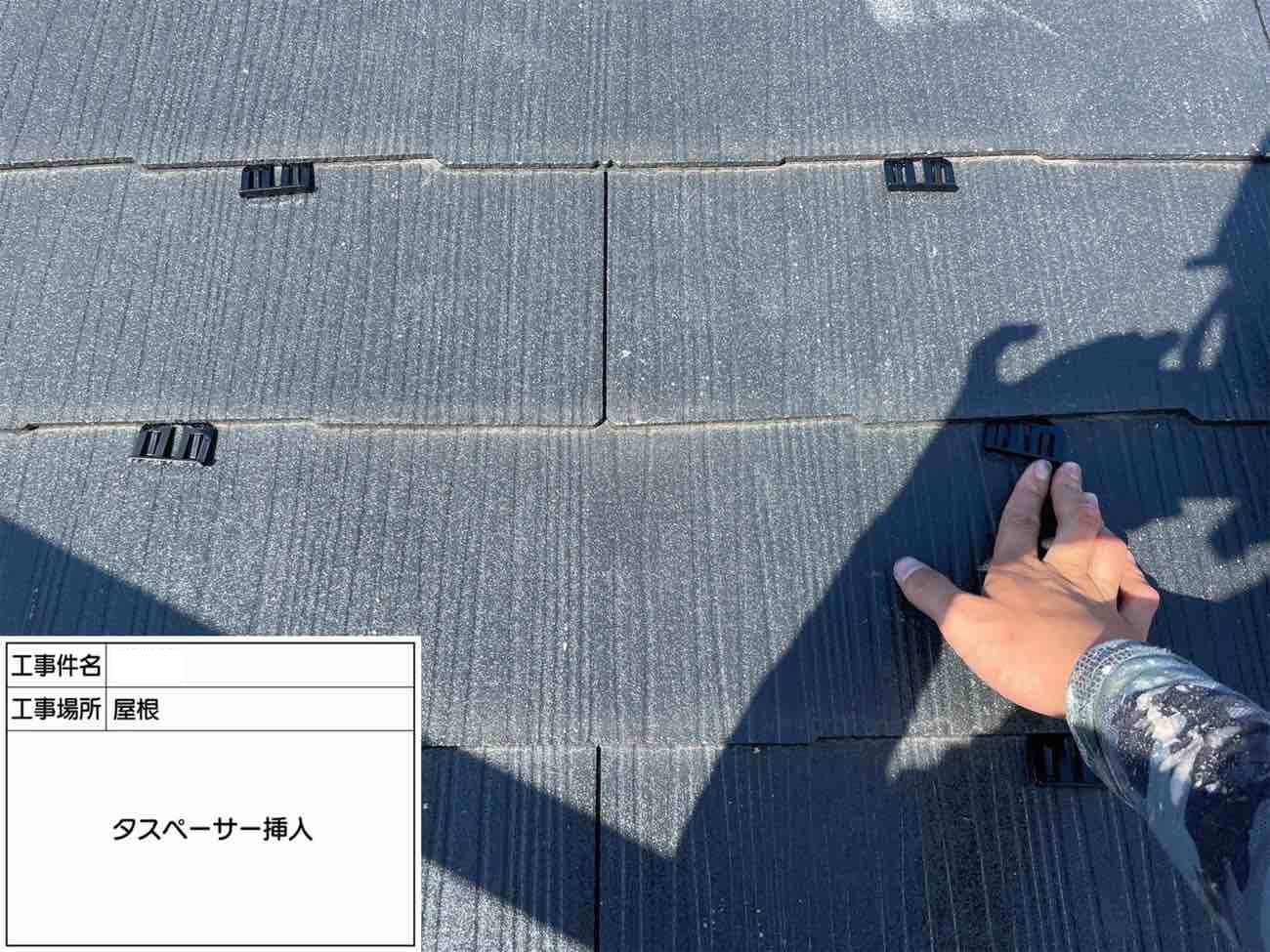 タスペーサーを一つ一つ手作業で取り付けていきます。 取付けることにより雨漏りを防ぐ役割があります。