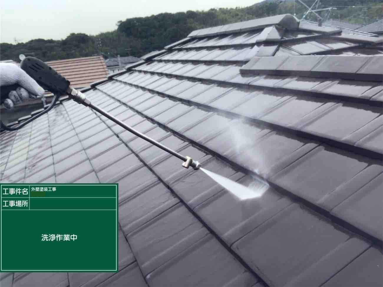 まずは屋根の高圧洗浄を行い細かな汚れまで落としていきます。