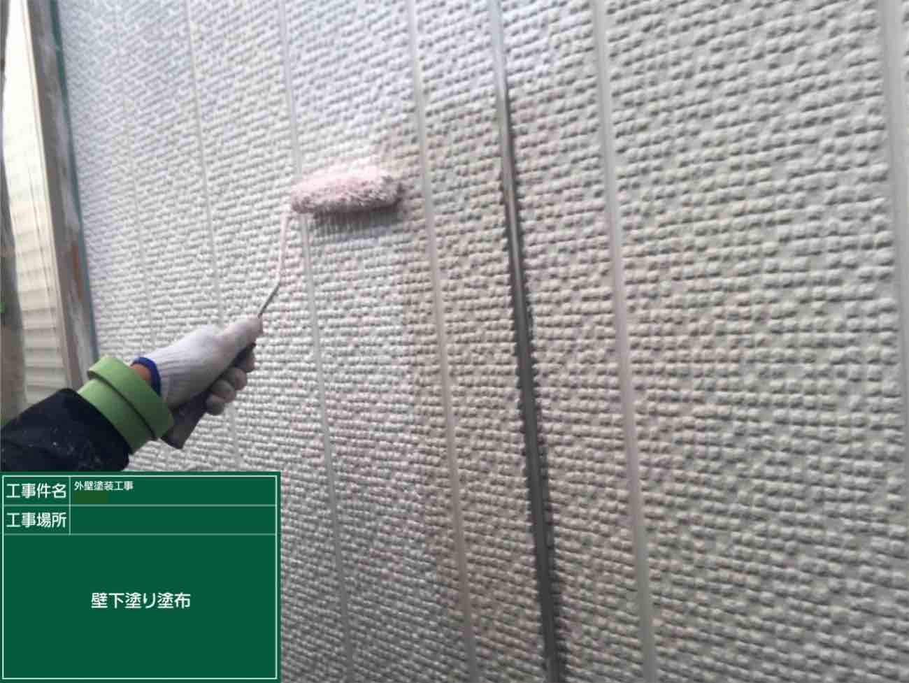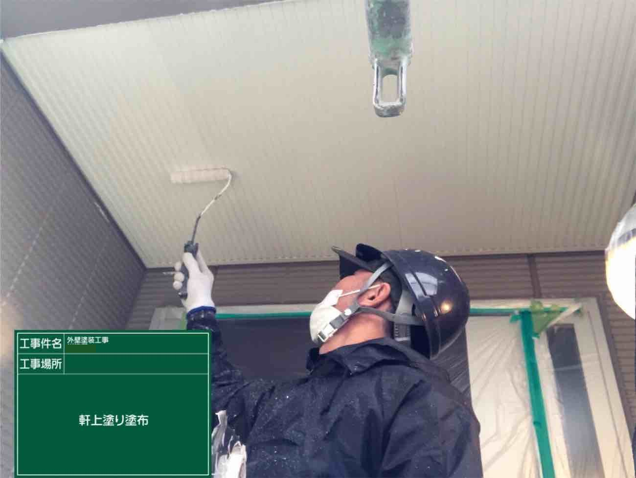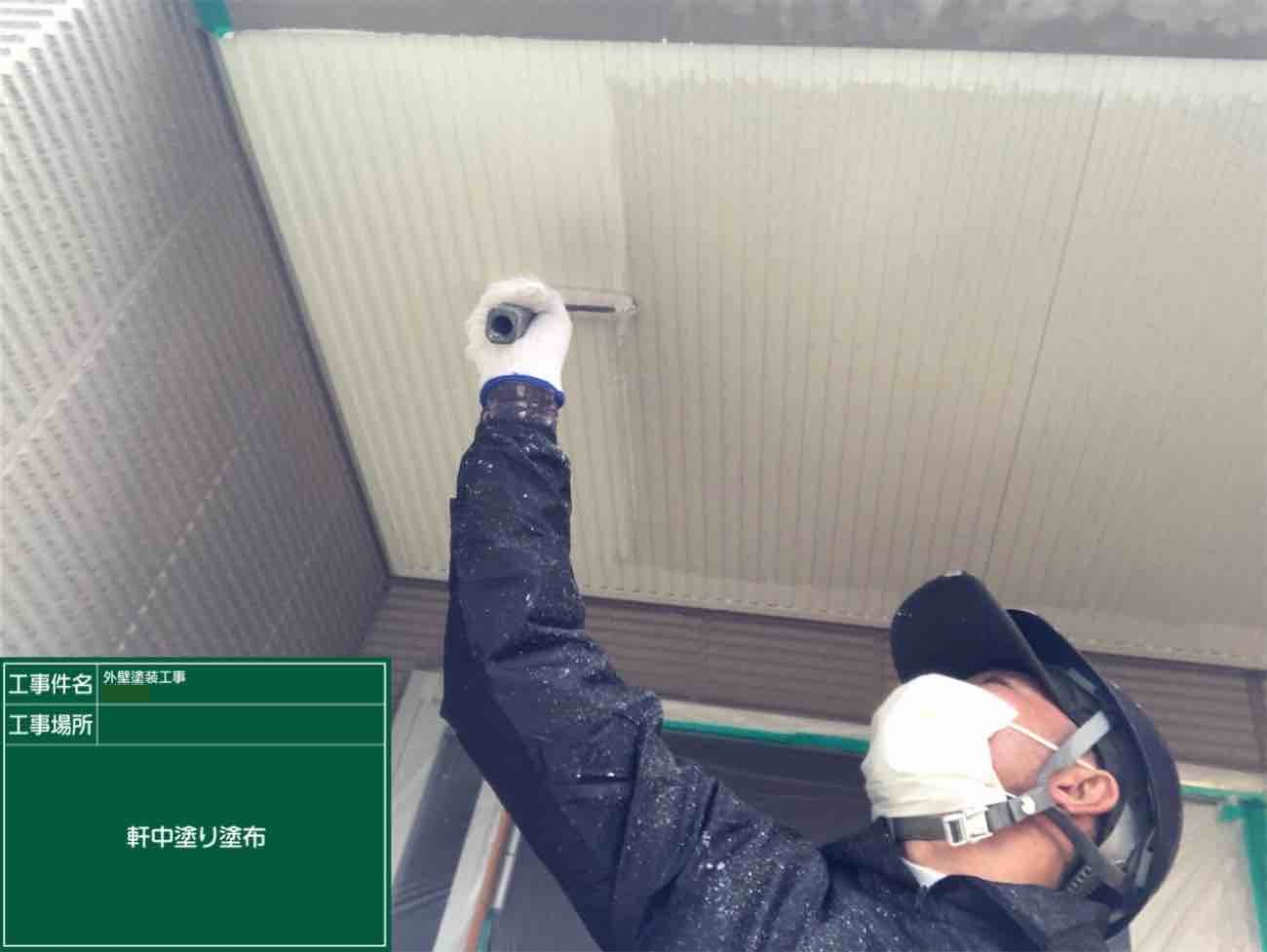 外壁と同様に高圧洗浄で汚れを綺麗に落とした後の軒天の上塗り1回目です。 この工程で色を入れていきます