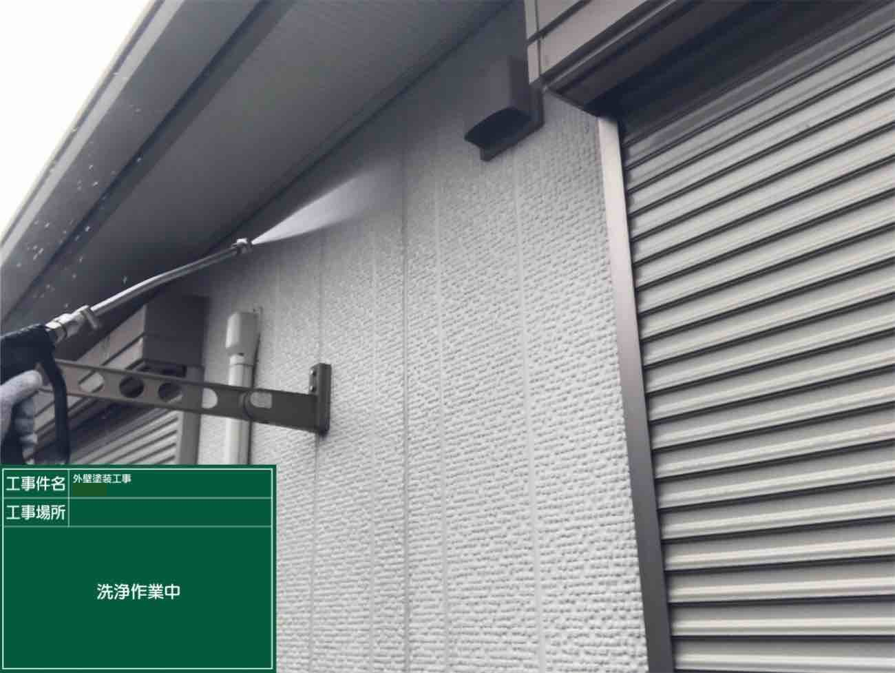 外壁の高圧洗浄作業です。 高圧洗浄作業で汚れを綺麗に落としていきます。