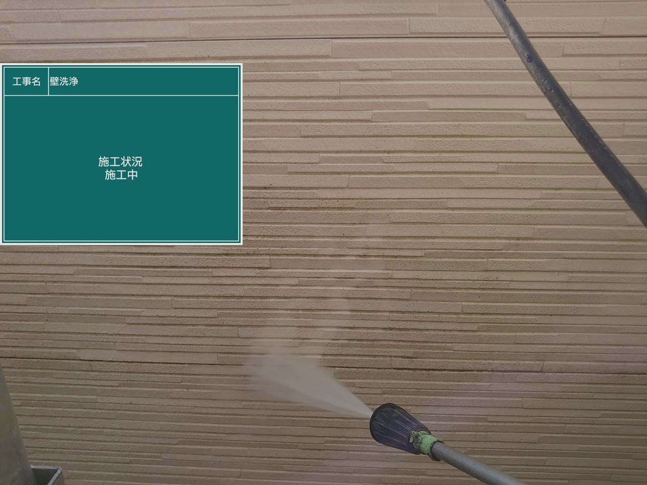外壁の高圧洗浄作業です。 高圧洗浄作業で汚れを綺麗に落としていきます。
