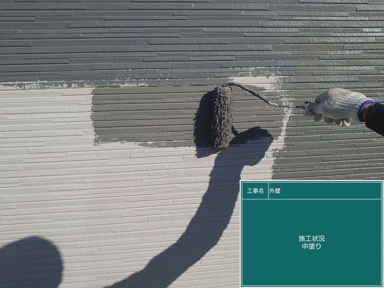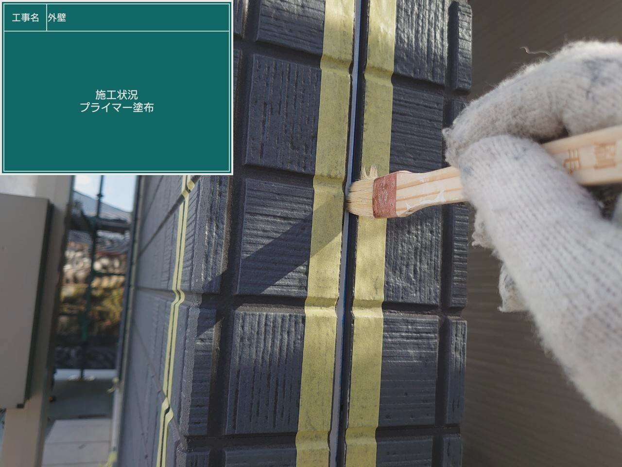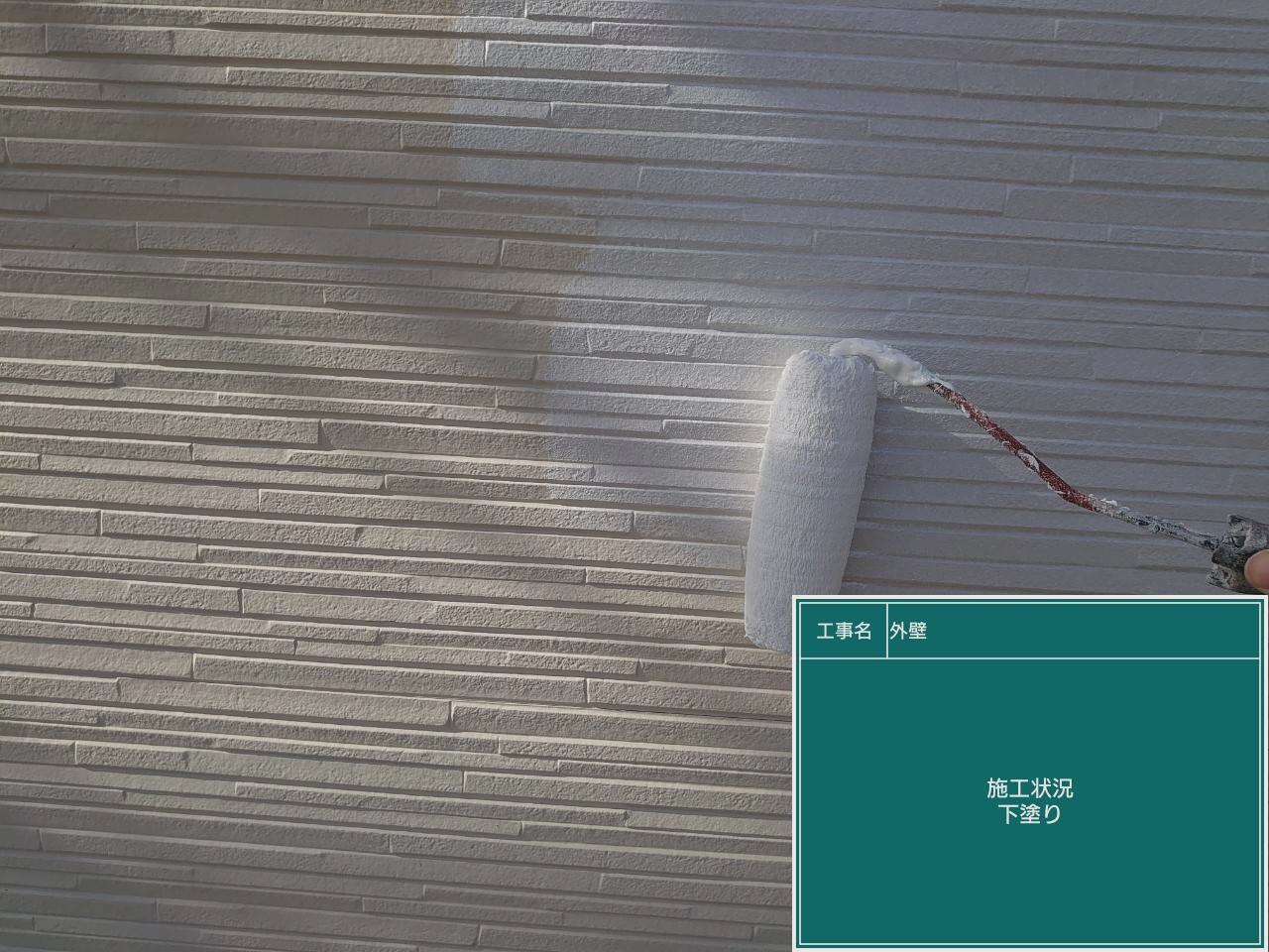 外壁の下塗り塗装作業です。下塗りで上塗り塗料の密着性を高めます。