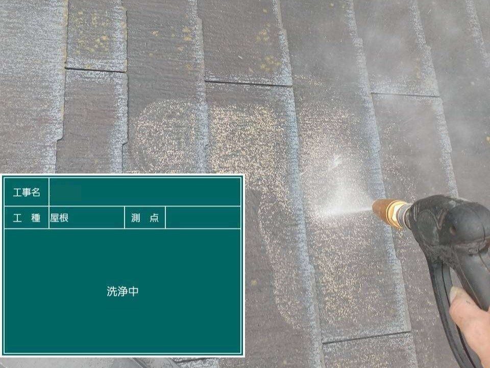 屋根の洗浄作業を行います。屋根に付着している汚れを高圧洗浄機で落としていきます。