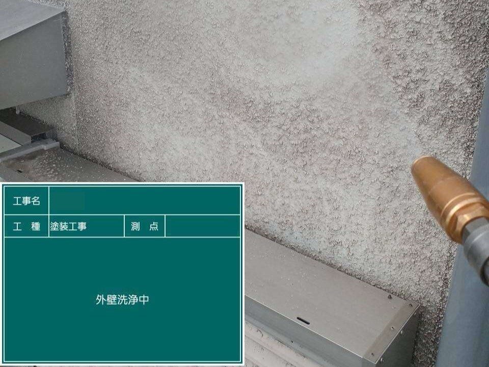 外壁も同様に洗浄作業で汚れを落としていきます。洗浄せず汚れが残っていると塗膜がはがれてしまったりしてしまいます。