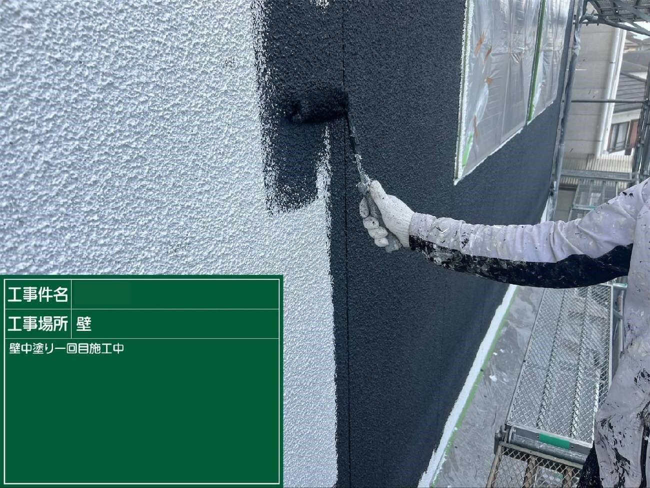 外壁の中塗り作業です。 先程、下塗りをおこない乾燥させたら、上塗りに使用する塗料を塗っていきます。 中塗りは1回目の上塗りと同じであり厚みをだし最後の上塗りで仕上げていきます。