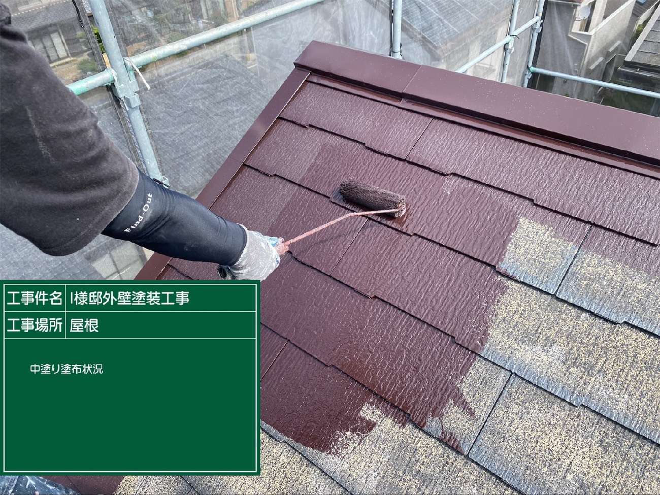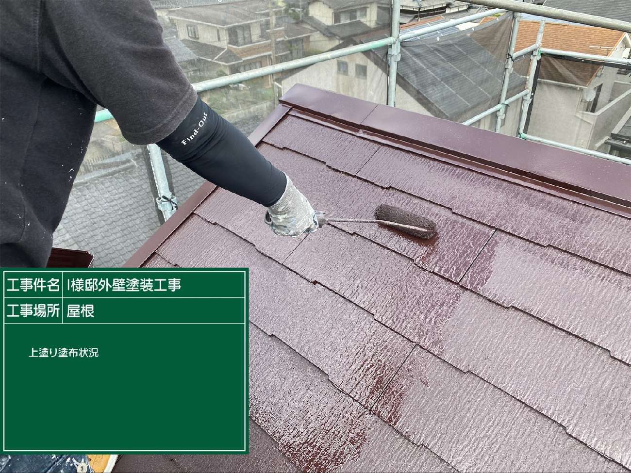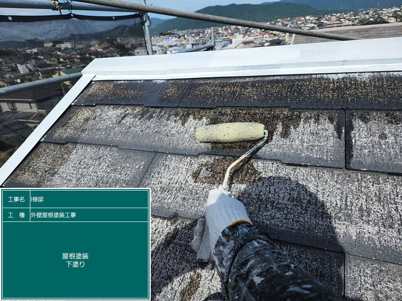 いよいよ屋根の塗装作業を行っていきます。屋根も外壁も同様ですが3回塗りを行っていきます。まずは下塗りです。下塗りで上に塗る塗料の密着性を高めていきます。