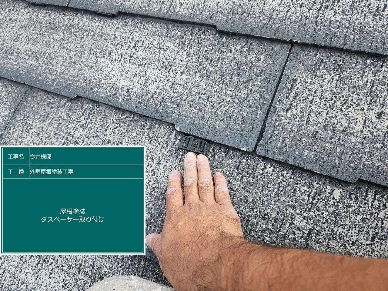 屋根の塗装を行っていきますが、これはタスペーサーといって縁切りの役割のある工具を屋根材の隙間に差し込んでいきます。これを間にさし、空気の通り道を作っていきます。