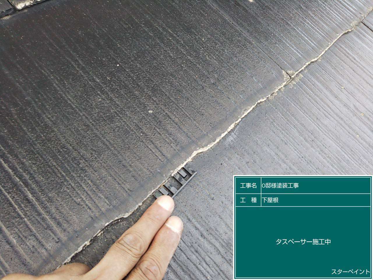 塗装作業に入る前に屋根材の隙間にタスペーサーを取り付けていきます。タスペーサーは縁切りの役割をもっており塗膜で空気の通り道が塞がるのを防ぎます。