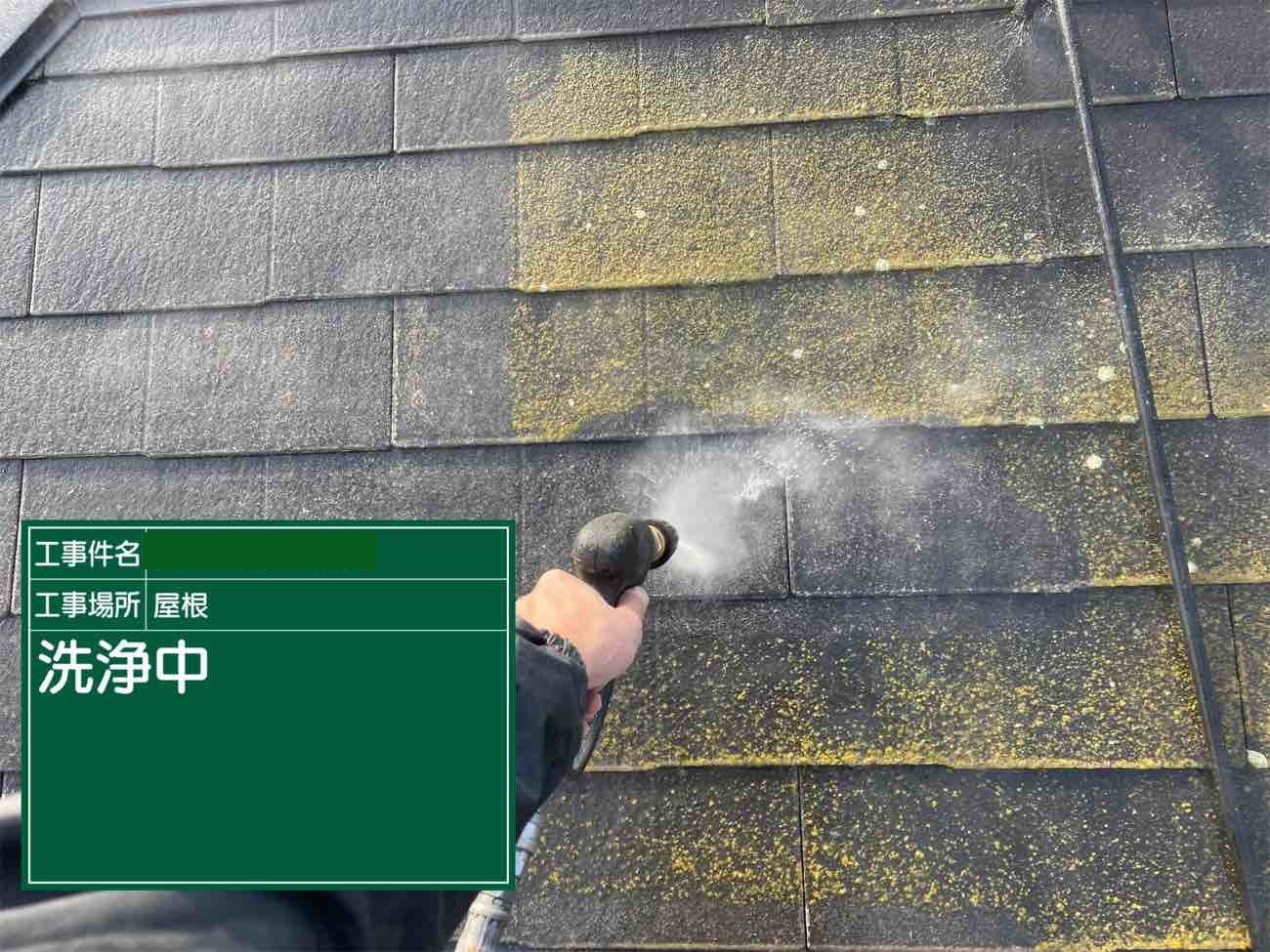 屋根についた苔やカビを高圧洗浄で洗い流します。