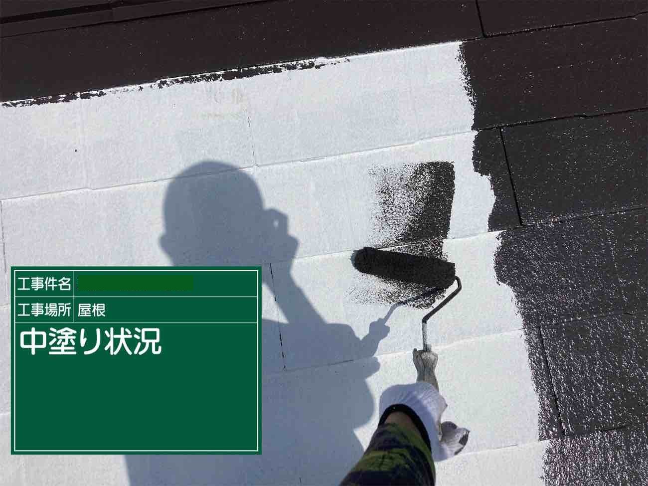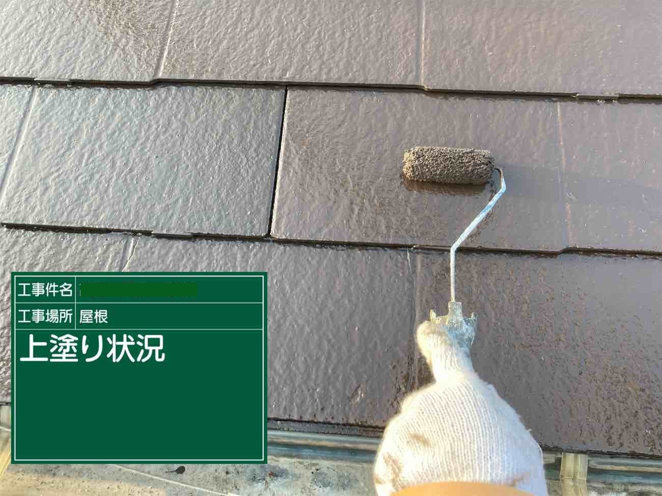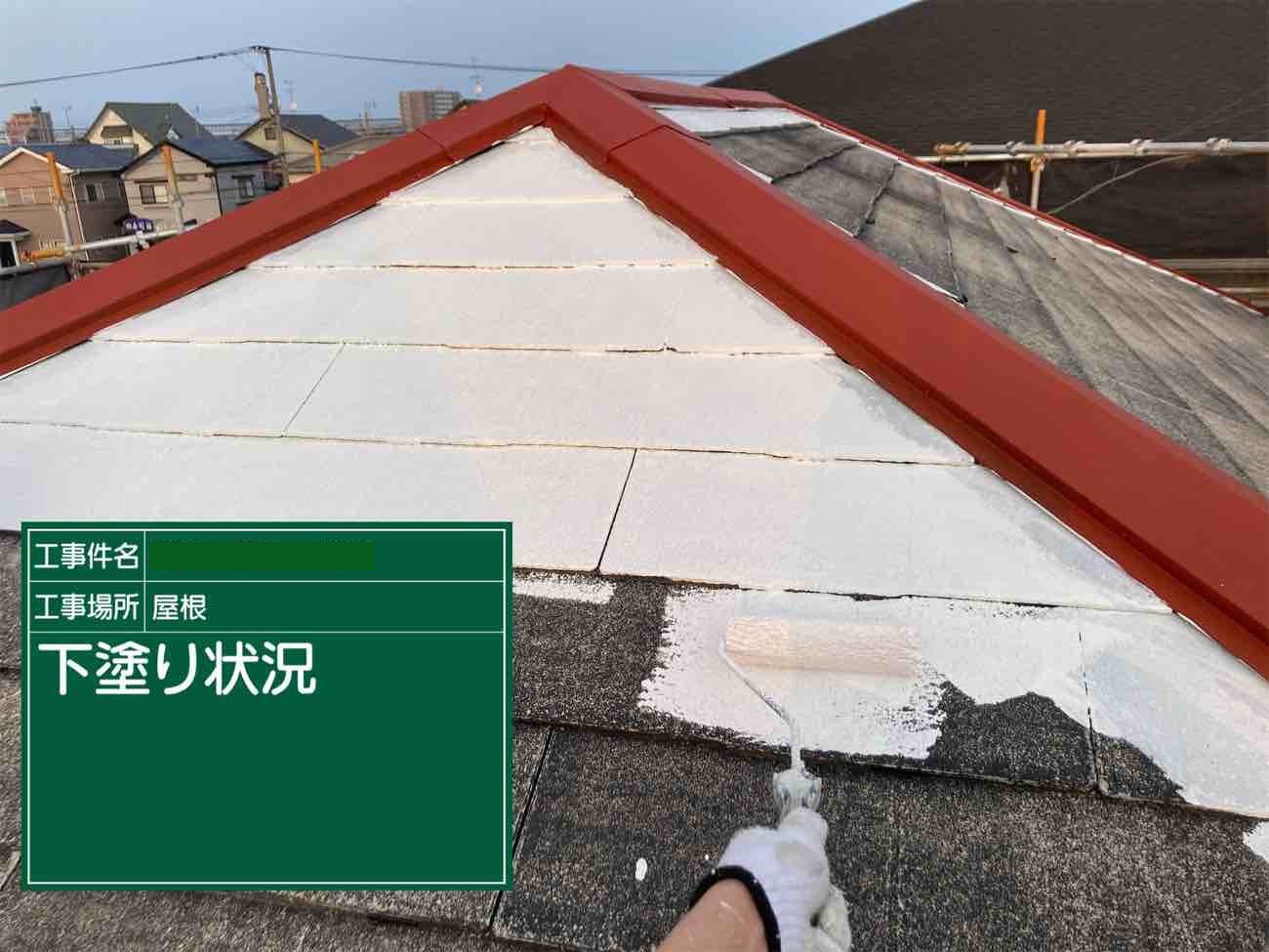 屋根は下塗りから塗っていきます。 下塗りを塗ることで、あとから塗る塗料の密着性を高めます。