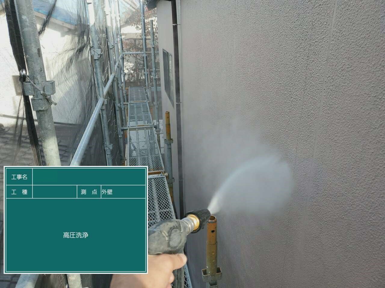 外壁についている汚れを高圧洗浄で洗い流します。
