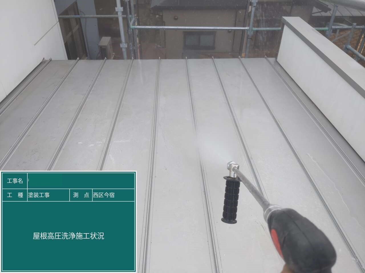 屋根についた汚れを高圧洗浄機で洗い流していきます。