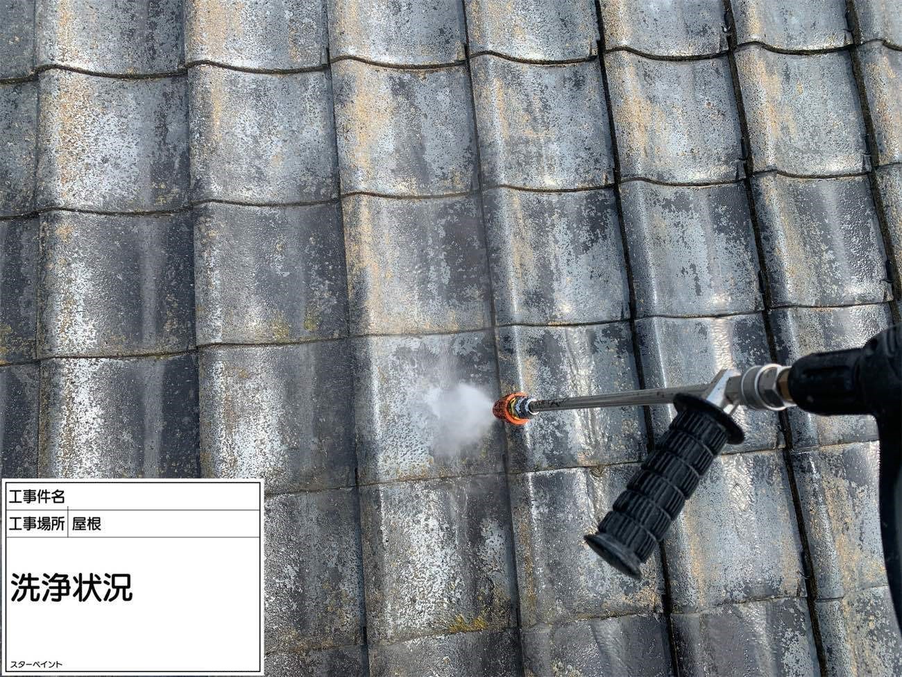 紫外線が直接当たるので劣化が一番早いのが屋根です。 高圧洗浄でしっかり洗い流していきます。