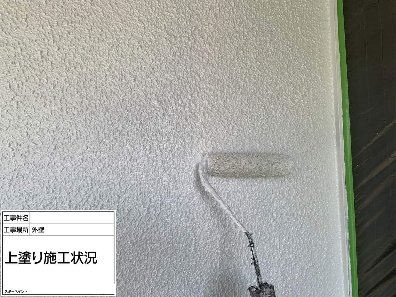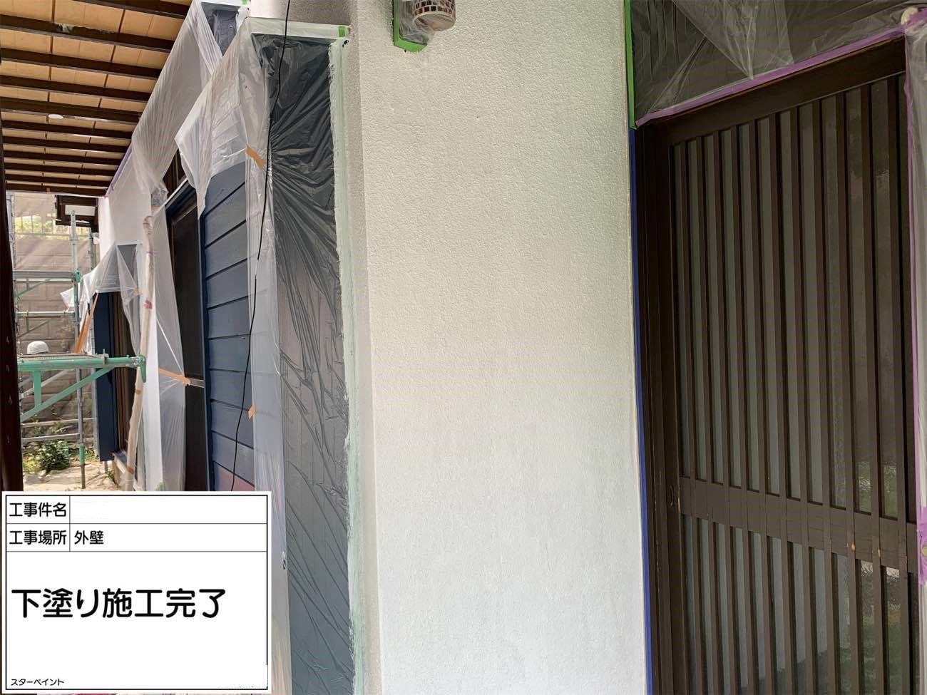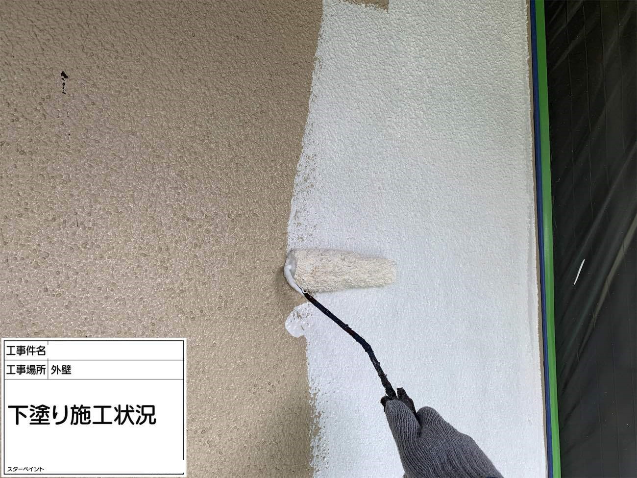 外壁は下塗りから始めます。 下塗りで下地を整え、真っ白の状態にします。