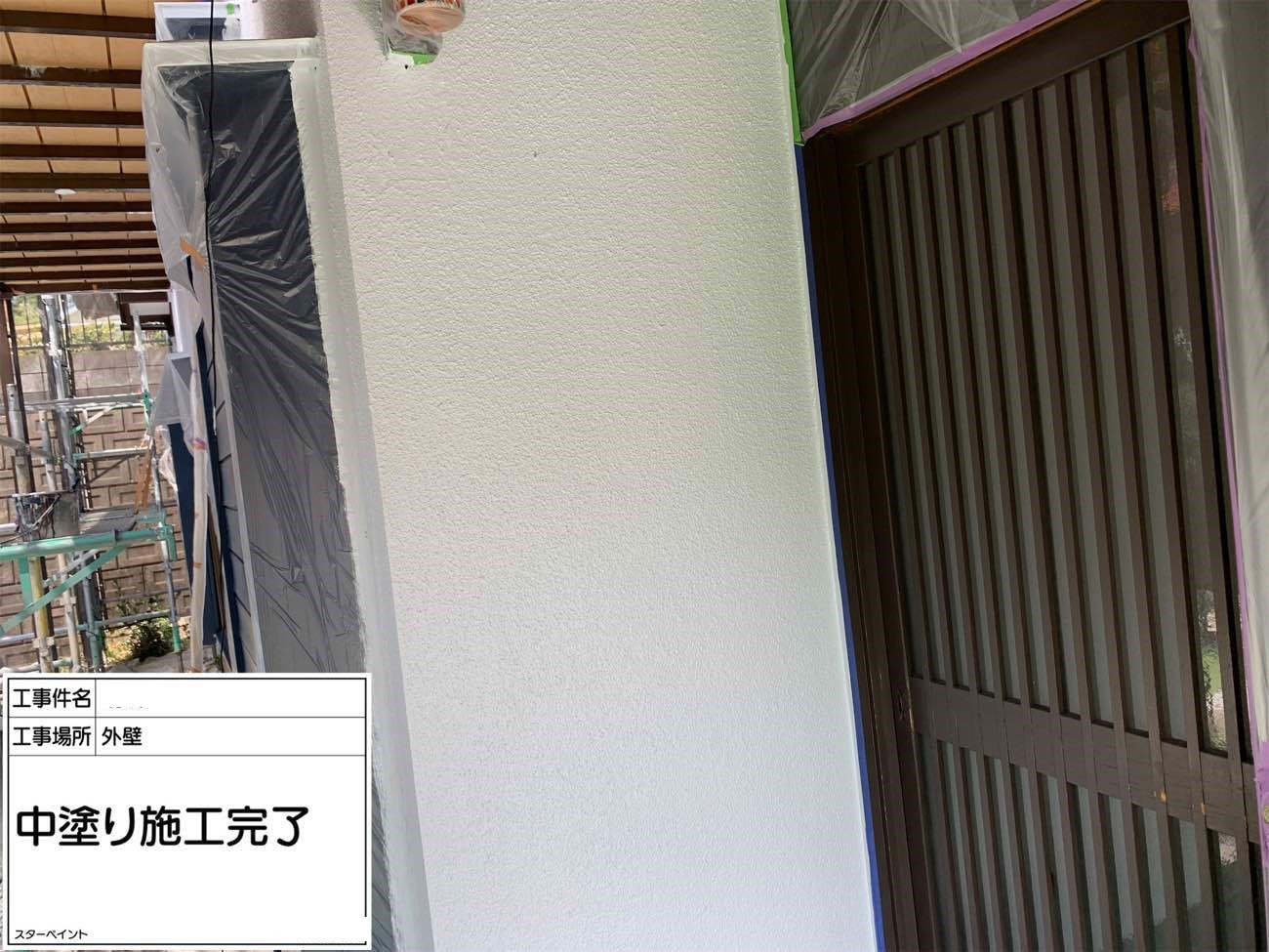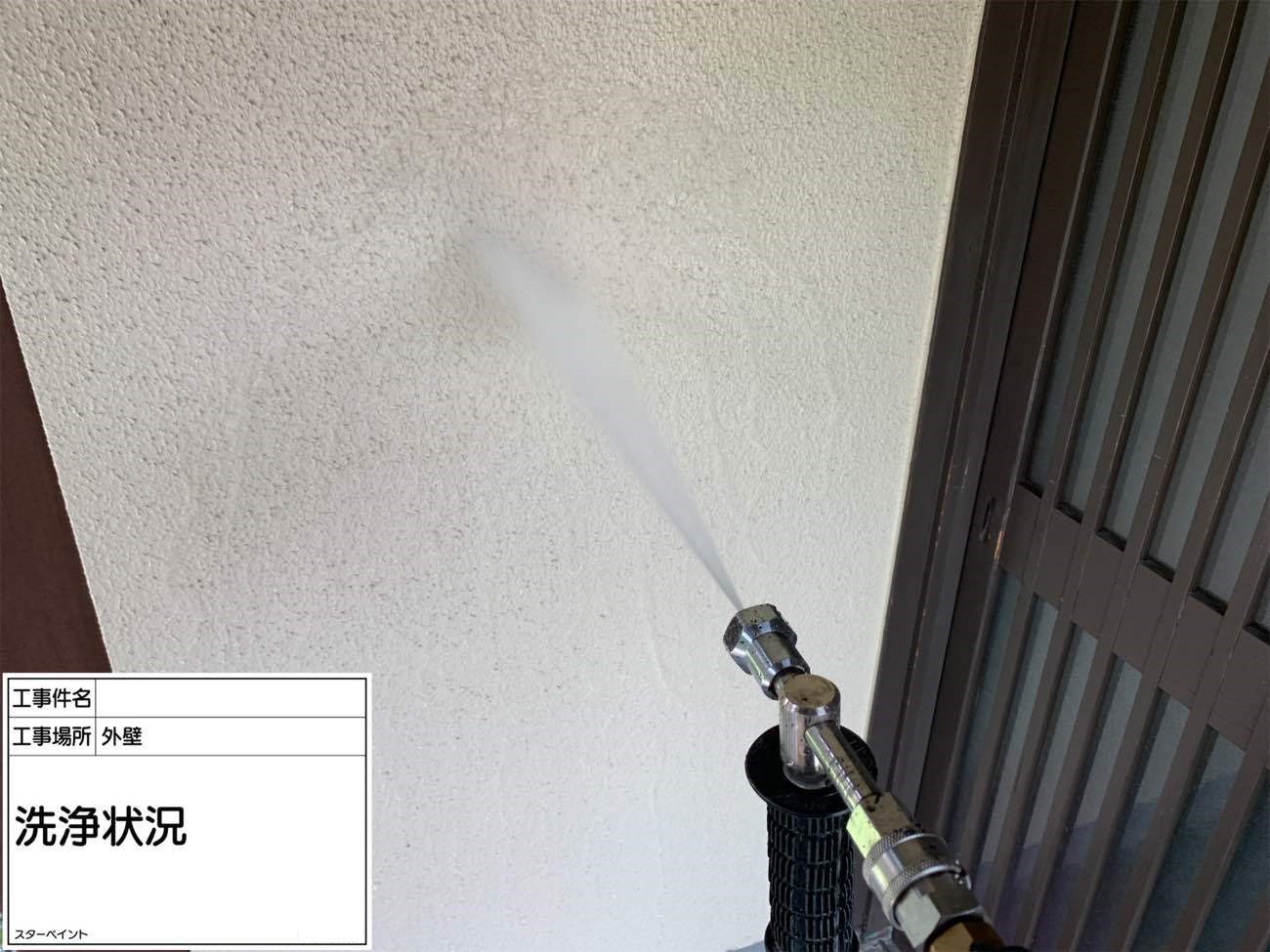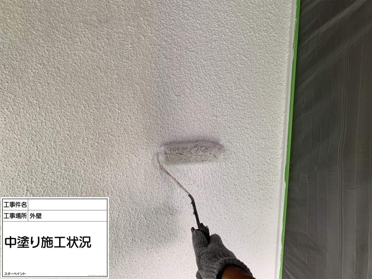 外壁は下塗りから始めます。 下塗りで下地を整え、真っ白の状態にします。
