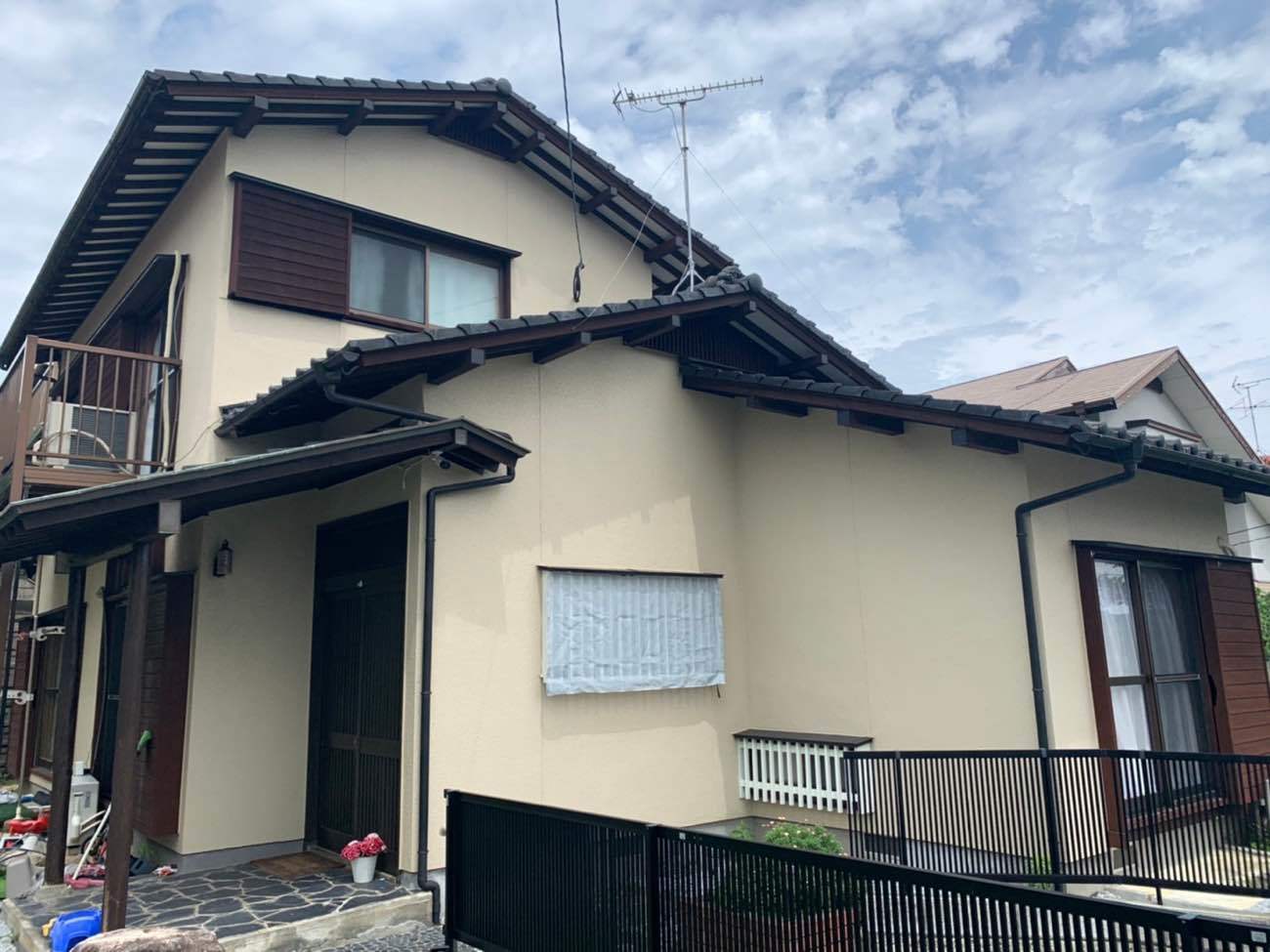 築40年の建物で、外壁の経年劣化に加え、雨樋の劣化や錆も見受けられたため、今回は塗装工事とあわせて雨樋交換・エアコン工事を同時に行いました。 近隣との距離が近...