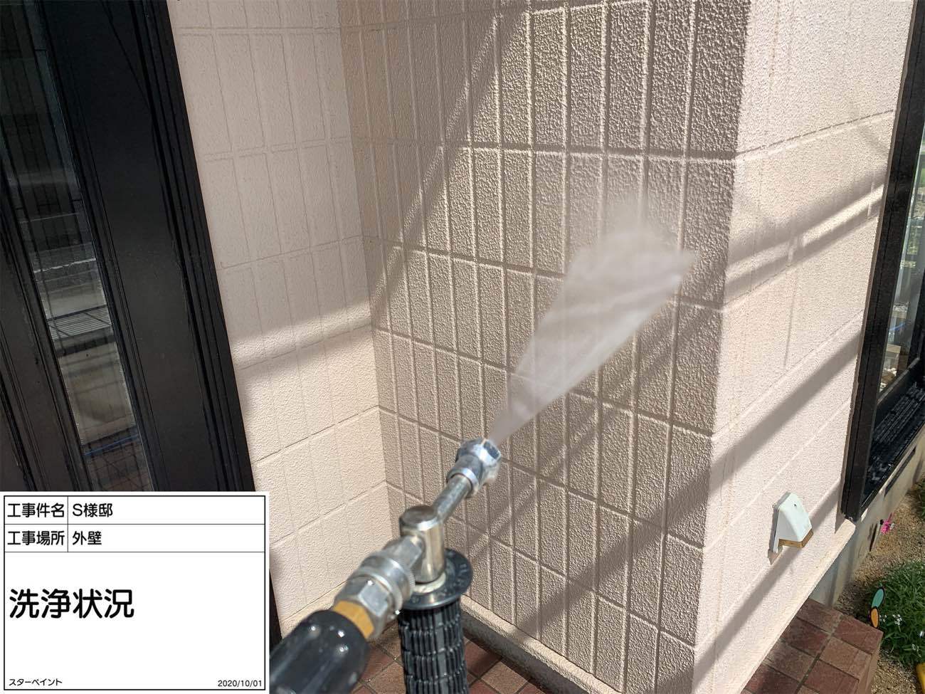 塗り工程にはいる前に、外壁の汚れを洗い流します。