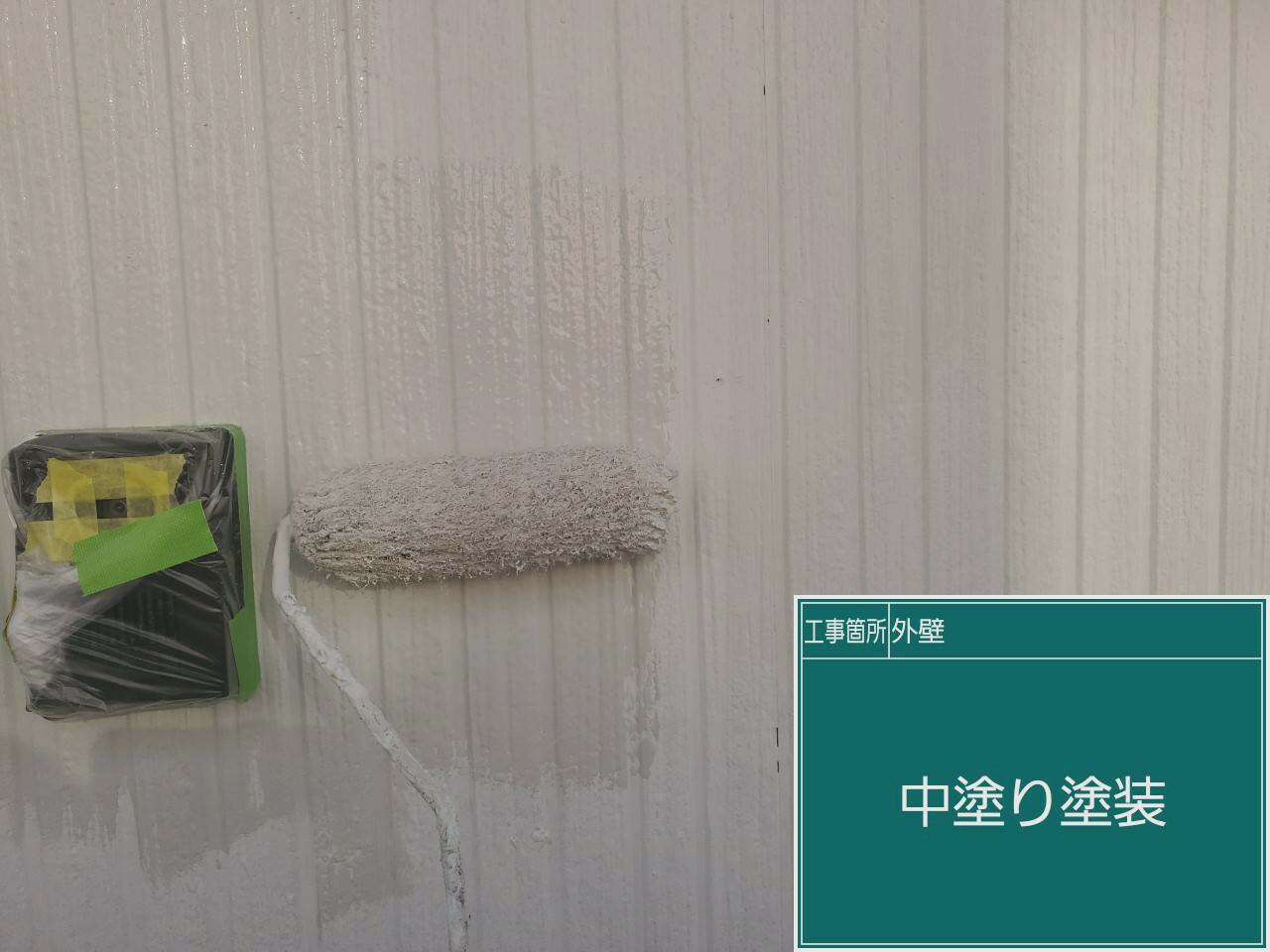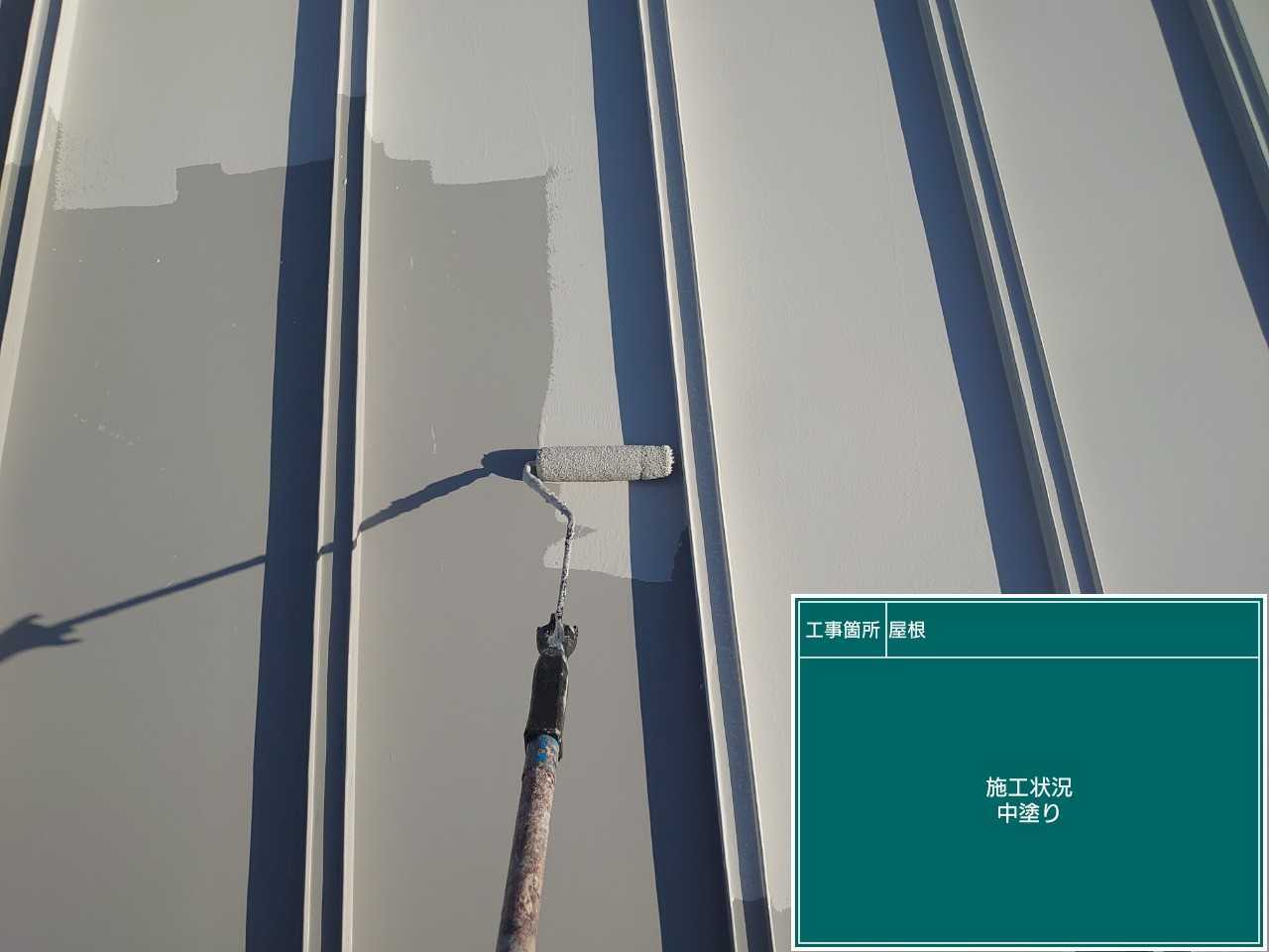 次に中塗りです。外壁も屋根も同じように中塗りで厚みをだし上塗りの補強を行います。