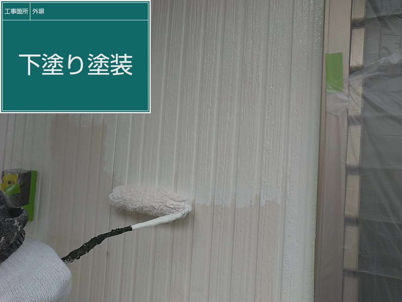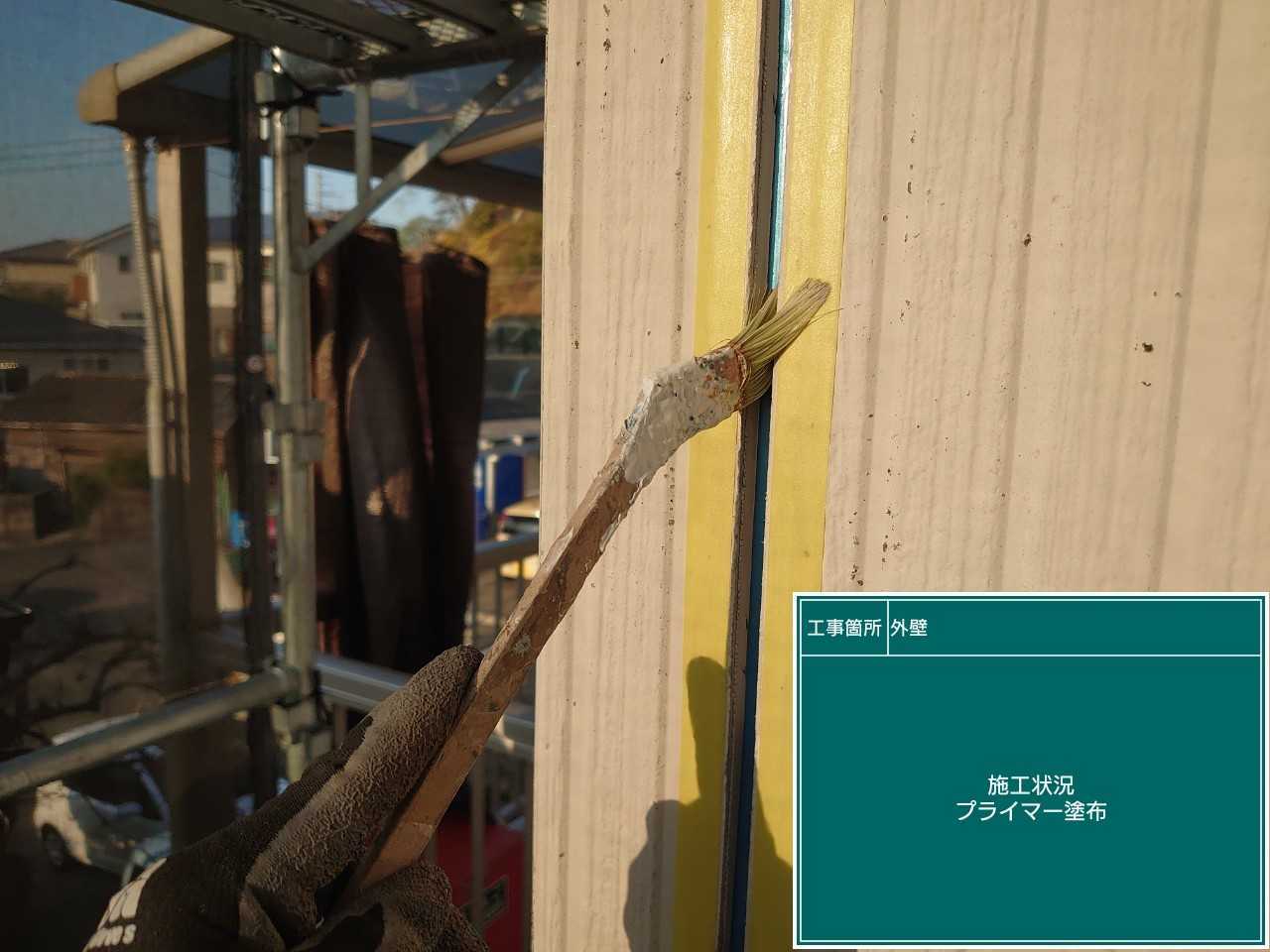 いよいよ外壁の塗装を行っていきます。 下塗りの塗装工程になります。こちらでは、外壁との密着性を高めていきます。