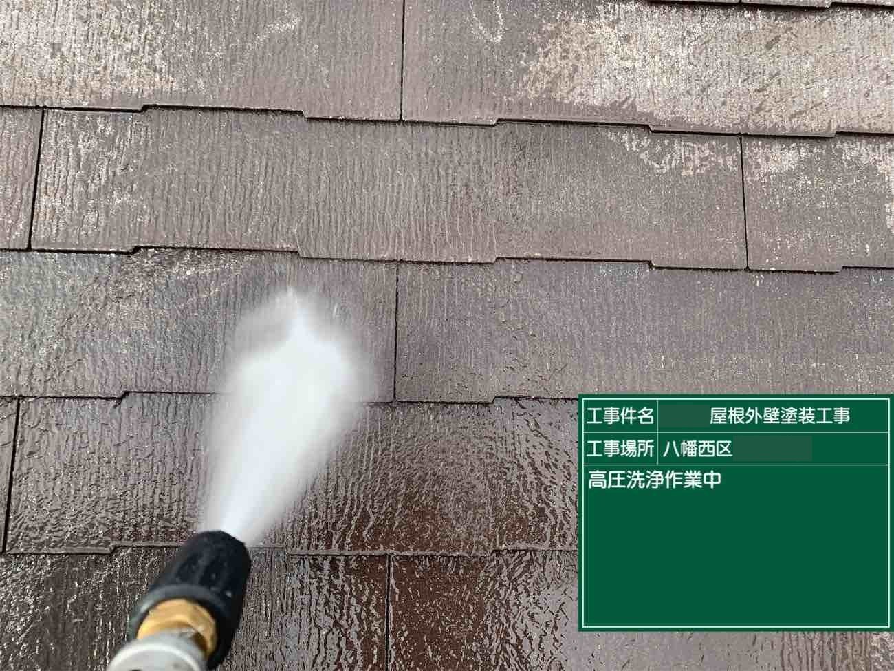 屋根の高圧洗浄作業です。 屋根のコケや汚れを掃除し、洗浄で落としていきます。