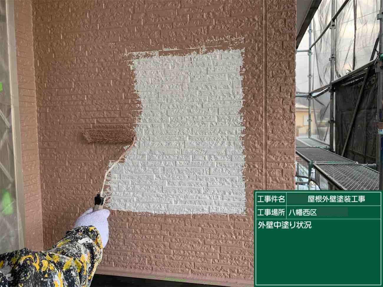 次に中塗り。外壁を見ると下塗りが白いため中塗りで厚みを出し基材の劣化をおさえます。
