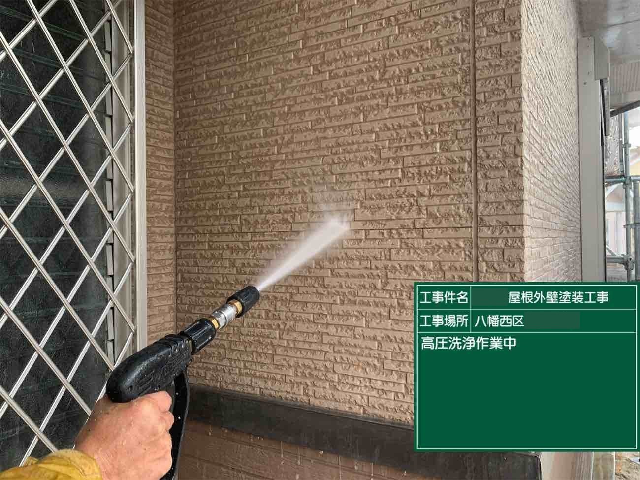 外壁も同様に洗浄していきます。洗浄で汚れを落としたら乾燥させるために時間を空けます。