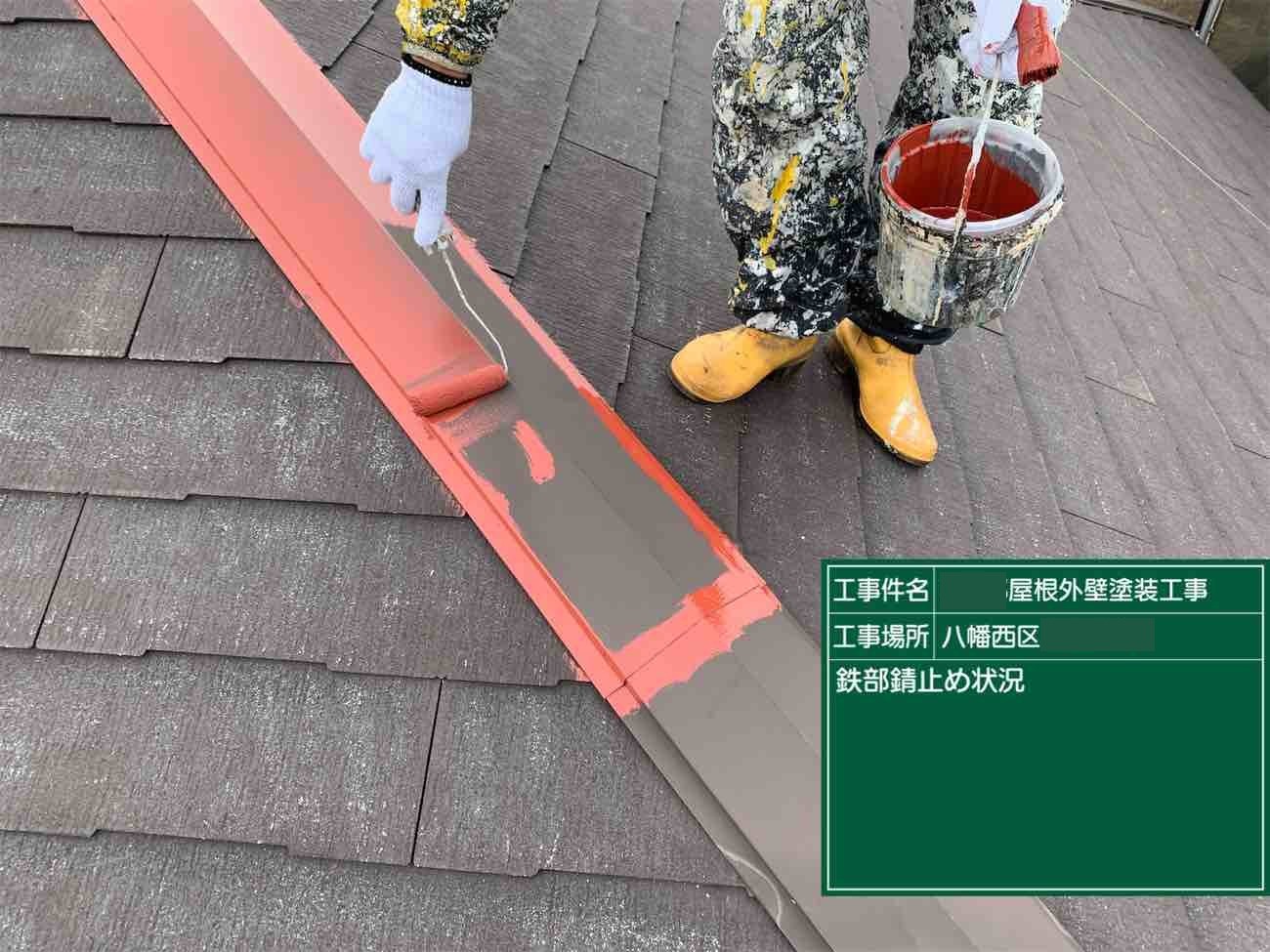 乾燥したらまずは屋根の板金部分の錆止め作業を行います。板金は金属になるので事前に下塗りとして錆止めの塗料を塗っておきます。