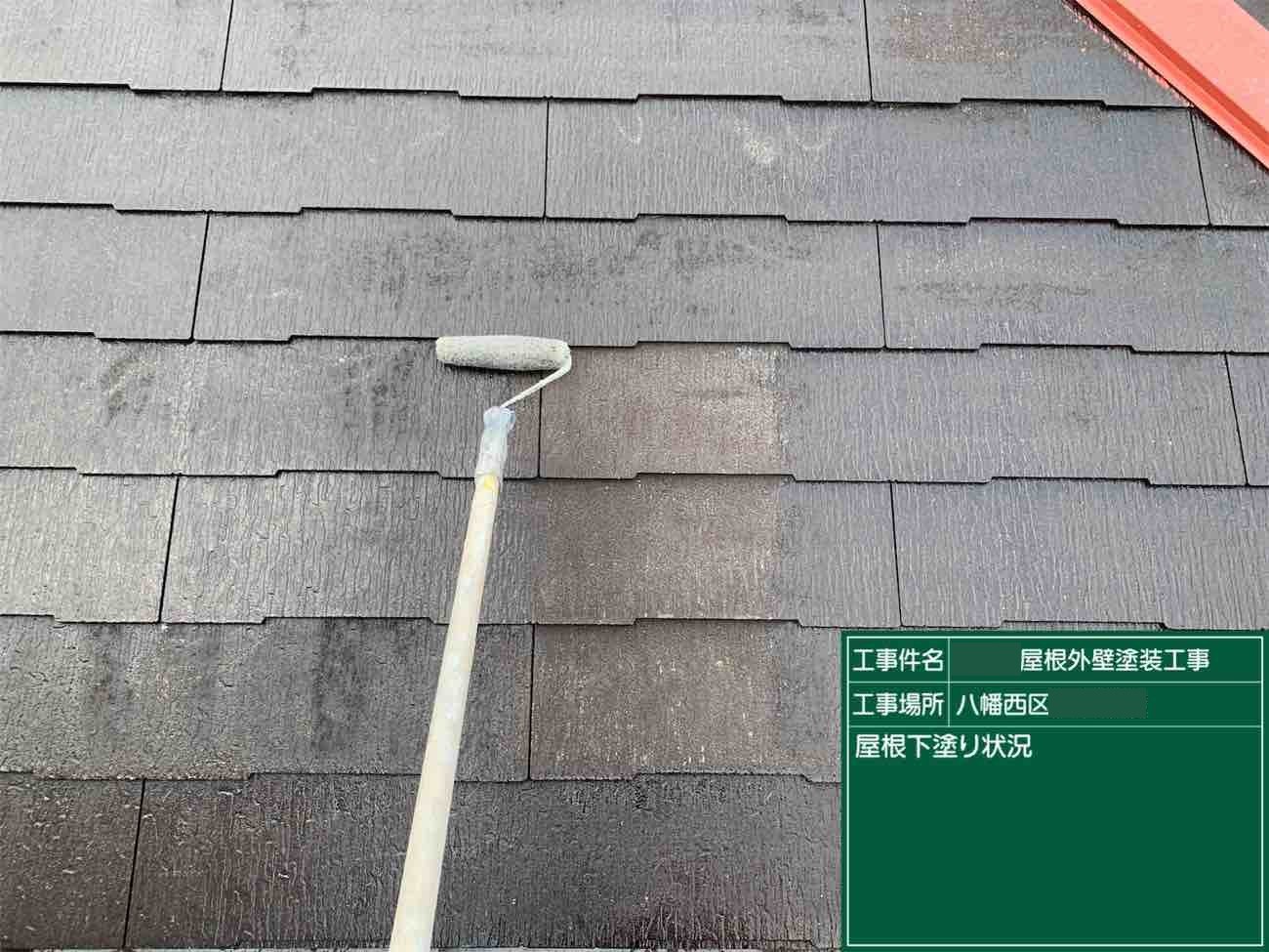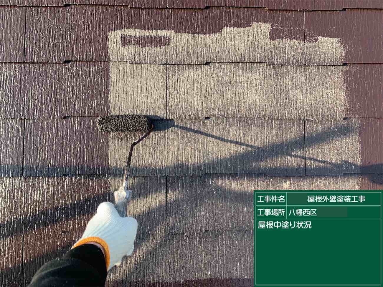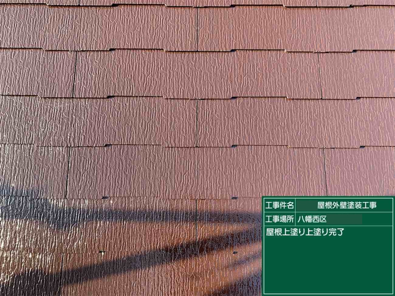 最後に上塗りです。先程の中塗りで上塗り前の補強を行い、さらに上から上塗りを行うことで厚みを出し、 屋根材を守る役割を果たします。