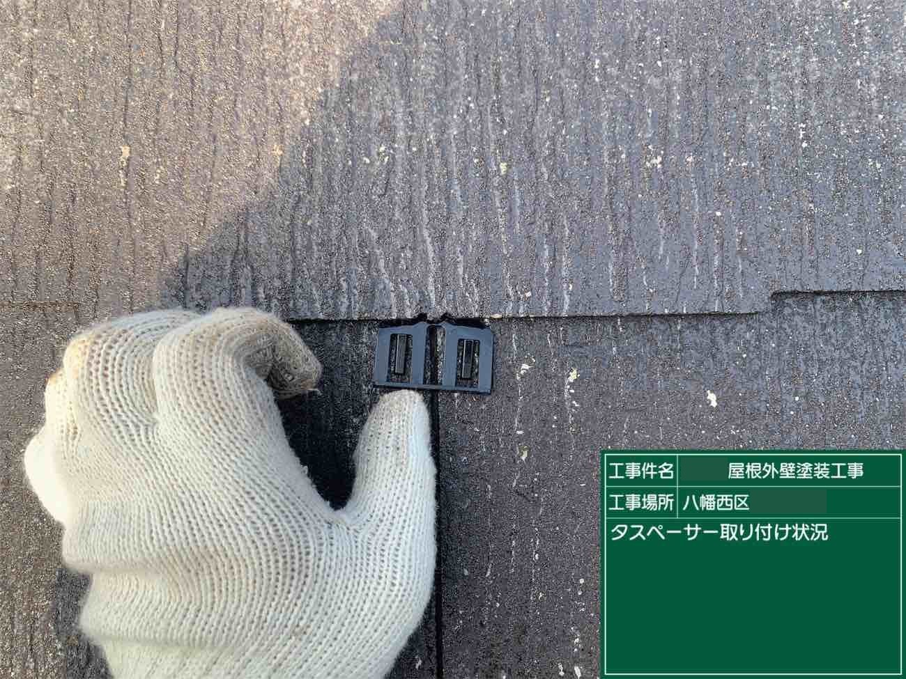下塗りが完了したら、屋根材との間にタスペーサーを入れていきます。 これは縁切りの役割を果たすのです。