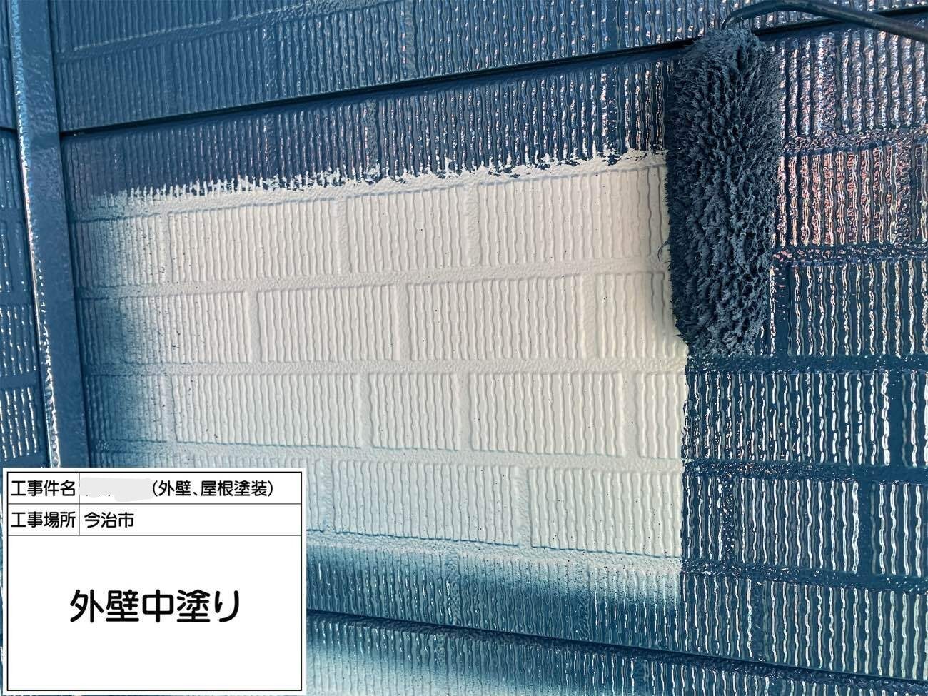 こちらは外壁の「中塗り」工程です。写真のように、下塗りで整えた下地の上に中塗り材を均一に塗布し、仕上げ塗り(上塗り)の発色や耐久性を高める重要な作業になります。