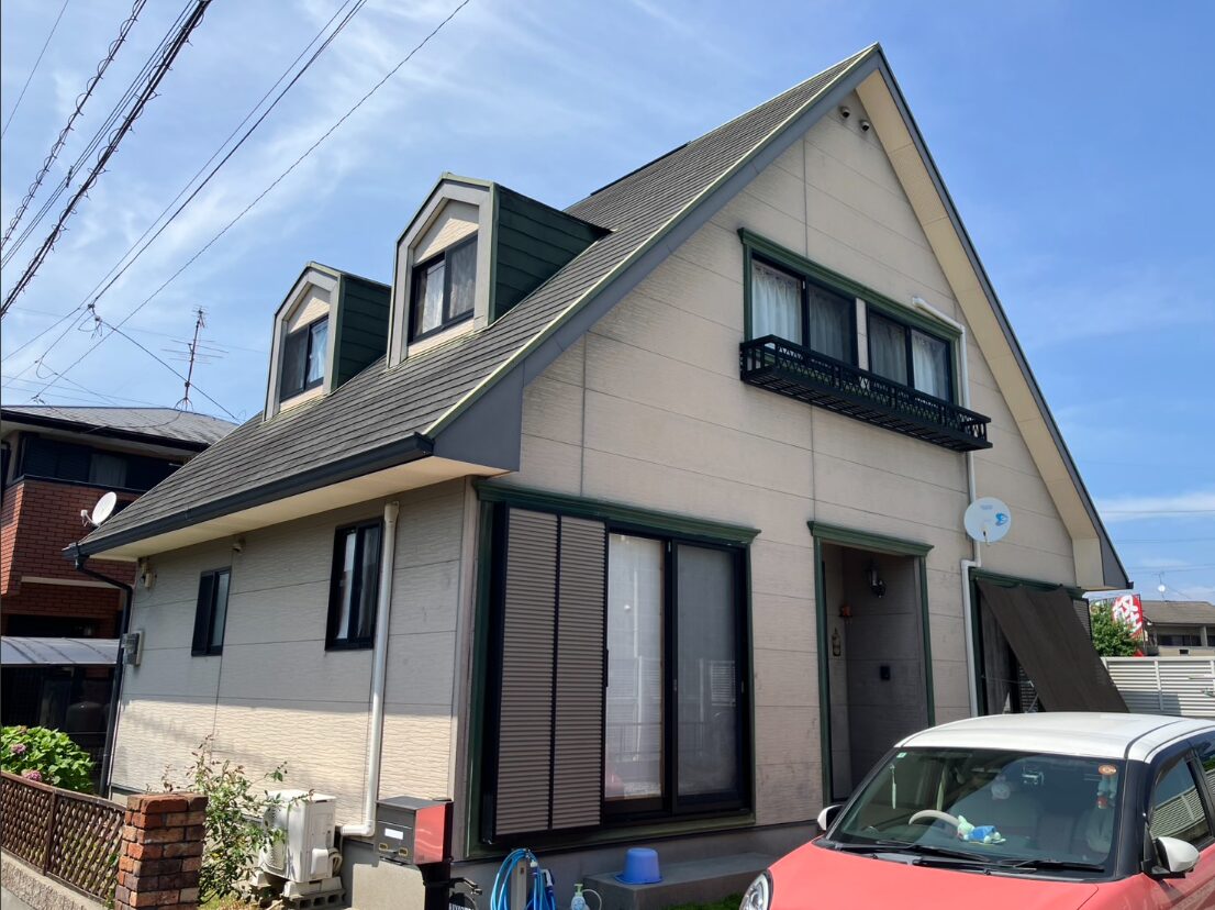 宇土市にお住まいのH様より、築26年を迎えたお家の屋根・外壁塗装についてご相談をいただきました。 現地調査を行い、建物の劣化状況や今後のメンテナンス周期についてご説明を差し上げるうちに、 「せっかく塗装するなら、長持ちする塗料を選びたい」とご希望されました。 スターペイントでは、塗料の耐久性やトータルコストの観点から、高耐候性の無機塗料プランをご提案。 短期的な安さだけでなく、「10年後も安心して住める塗装」を実現する方針で進めました。 施工前は外壁のくすみやコケ汚れが全体的に目立ち、屋根も色あせによる退色が進行していました。 施工後は外壁の艶が復活し、防水性・耐候性ともに向上。 屋根のグリーンカラーが青空に映え、全体的に明るく若々しい印象に生まれ変わりました。