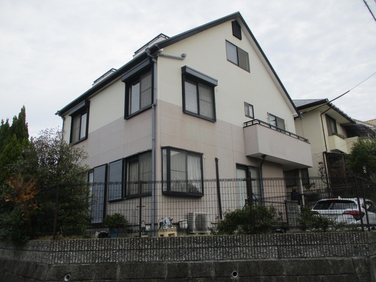 - 今回ご依頼いただいたのは、愛媛県松山市にお住まいのお客様からの外壁および屋根の塗装工事です。築年数の経過に伴い、外壁の色あせや細かな汚れ、屋根の表面劣化などが気になり始めたことをきっかけに、メンテナンスをご検討されていました。 現地調査を行ったところ、外壁材であるALCには大きな損傷は見られなかったものの、経年による塗膜の劣化が進行しており、防水性能が低下している状態でした。また屋根材であるコロニアルにも紫外線や雨風の影響による塗膜の劣化が見られ、防水性や遮熱性能の低下が懸念されました。 そこで今回の工事では、まず高圧洗浄によって長年蓄積された汚れや旧塗膜の弱った部分を丁寧に除去し、塗料の密着性を高める下地処理を徹底。そのうえで外壁には耐候性と美観を兼ね備えた塗料を、屋根には遮熱性能に優れた塗料を使用することで、住まいを長く守る塗装工事を実施しました。 外壁は下塗り材で下地をしっかり整えた後、中塗り・上塗りと塗り重ねることで塗膜の厚みを確保し、耐久性の高い仕上がりに。屋根についても下塗り材で塗料の密着力を高めたうえで、遮熱塗料を均一に塗布し、夏場の屋根表面温度上昇を抑える効果を持たせています。 見た目の美しさだけでなく、住宅の寿命を延ばすための機能性にもこだわった外装リフォームとなりました。