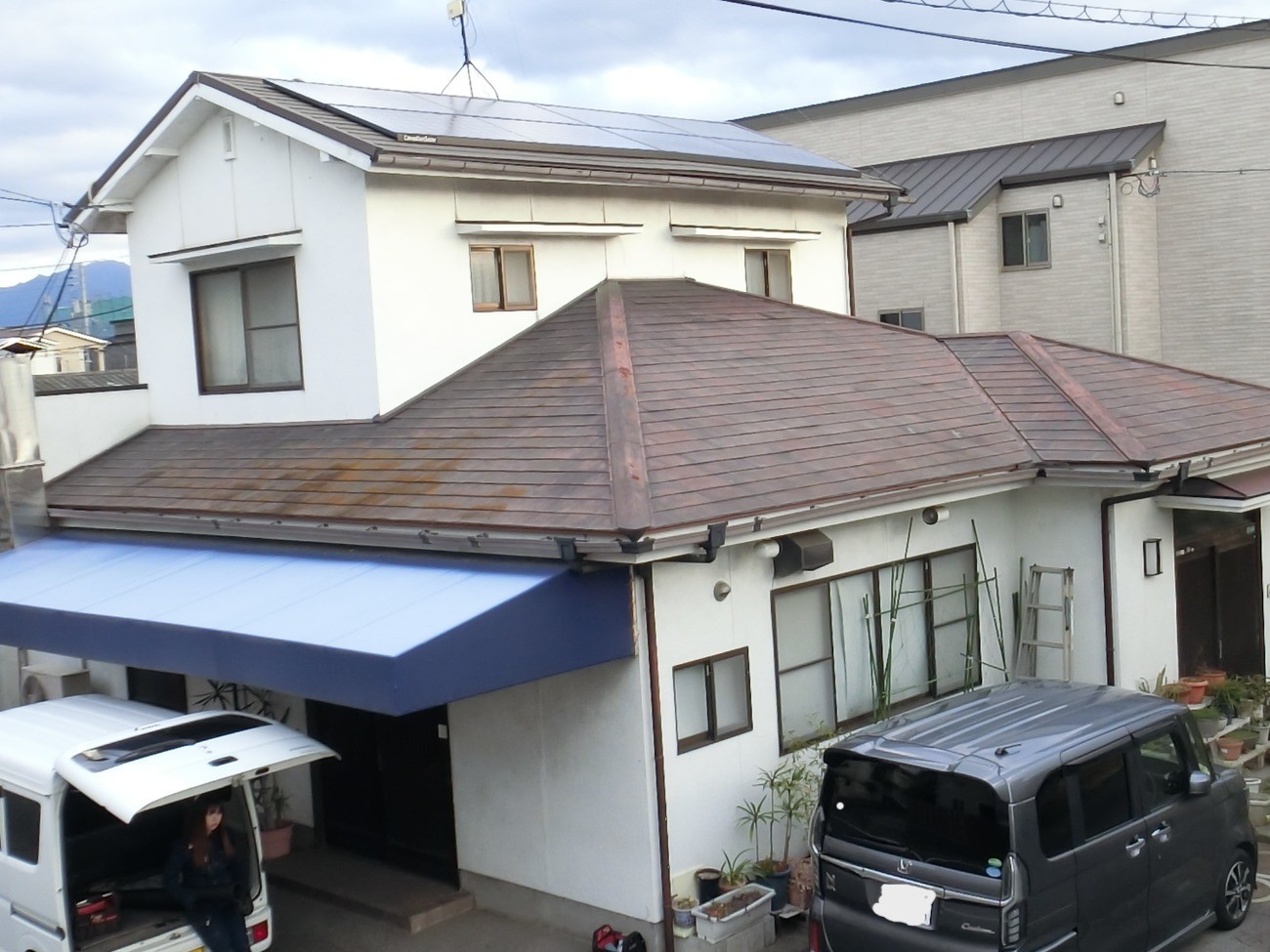 - 今回ご依頼いただいたのは、愛媛県松山市にお住まいのお客様からの外壁および屋根の塗装工事です。築年数の経過とともに外壁の色あせや細かなひび割れ、屋根の塗膜劣化が気になり始めたことから、住まいのメンテナンスとして塗装工事をご検討されていました。 現地調査を行ったところ、外壁のモルタルには経年による汚れの付着や塗膜の劣化が見られ、場所によっては細かなクラック(ひび割れ)も確認されました。また屋根についてはコロニアル部分とトタン部分の双方で紫外線や雨風の影響による塗膜の劣化が進行しており、防水性能の低下が懸念される状態でした。 そこでまず高圧洗浄により外壁や屋根に付着した汚れや古い塗膜を丁寧に除去し、塗料の密着性を高める下地処理を徹底しました。外壁には下塗り材としてキクスイロイヤルフィラーを使用し、モルタル外壁特有の微細な凹凸やヘアクラックを補修しながら下地を整えています。 屋根については下塗り材としてRMプライマーを塗布し、既存屋根材と上塗り塗料の密着力を高めることで耐久性の高い塗膜を形成。その上から遮熱性能と耐候性を兼ね備えた塗料を丁寧に塗り重ねることで、屋根材を長期間保護できる仕上がりとしました。 外壁・屋根ともに下塗り・中塗り・上塗りの工程をしっかり行うことで、見た目の美しさだけでなく住宅を守る塗装本来の機能を最大限発揮できる施工となりました。